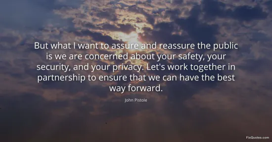 Pistole, John. (2026, January 15). But what I want to assure and reassure the public is we are concerned about your safety, your security, and your privacy. Let's work together in partnership to ensure that we can have the best way forward. FixQuotes. https://fixquotes.com/quotes/but-what-i-want-to-assure-and-reassure-the-public-167819/