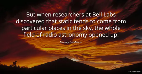 Gell-Mann, Murray. "But when researchers at Bell Labs discovered that static tends to come from particular places in the sky, the whole field of radio astronomy opened up." FixQuotes. January 17, 2026. https://fixquotes.com/quotes/but-when-researchers-at-bell-labs-discovered-that-28052/.