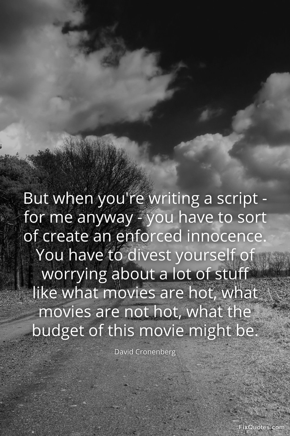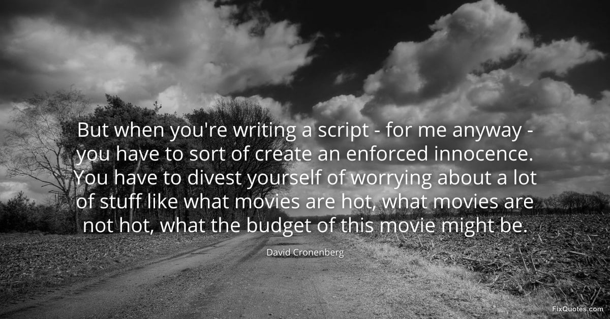 Cronenberg, David. (2026, January 17). But when you're writing a script - for me anyway - you have to sort of create an enforced innocence. You have to divest yourself of worrying about a lot of stuff like what movies are hot, what movies are not hot, what the budget of this movie might be. FixQuotes. https://fixquotes.com/quotes/but-when-youre-writing-a-script-for-me-anyway-53784/