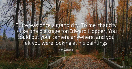 Wenders, Wim. "Butte was once a grand city. To me, that city is like one big stage for Edward Hopper. You could put your camera anywhere, and you felt you were looking at his paintings." FixQuotes. January 15, 2026. https://fixquotes.com/quotes/butte-was-once-a-grand-city-to-me-that-city-is-163631/.