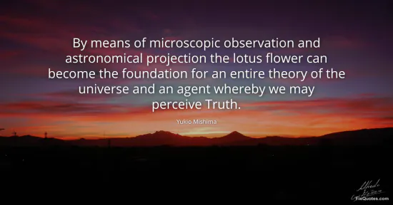 Mishima, Yukio. "By means of microscopic observation and astronomical projection the lotus flower can become the foundation for an entire theory of the universe and an agent whereby we may perceive Truth." FixQuotes. January 17, 2026. https://fixquotes.com/quotes/by-means-of-microscopic-observation-and-72670/.