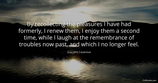 Casanova, Giacomo. "By recollecting the pleasures I have had formerly, I renew them, I enjoy them a second time, while I laugh at the remembrance of troubles now past, and which I no longer feel." FixQuotes. January 18, 2026. https://fixquotes.com/quotes/by-recollecting-the-pleasures-i-have-had-formerly-4538/.