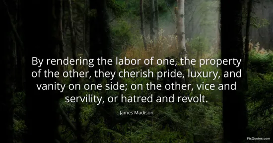 Madison, James. "By rendering the labor of one, the property of the other, they cherish pride, luxury, and vanity on one side; on the other, vice and servility, or hatred and revolt." FixQuotes. January 15, 2026. https://fixquotes.com/quotes/by-rendering-the-labor-of-one-the-property-of-the-31807/.