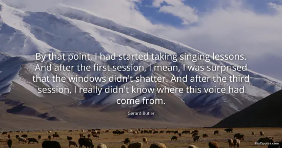 Butler, Gerard. "By that point, I had started taking singing lessons. And after the first session, I mean, I was surprised that the windows didn't shatter. And after the third session, I really didn't know where this voice had come from." FixQuotes. January 17, 2026. https://fixquotes.com/quotes/by-that-point-i-had-started-taking-singing-54505/.