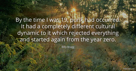 Bragg, Billy. (2026, January 15). By the time I was 19, punk had occurred. It had a completely different cultural dynamic to it which rejected everything and started again from the year zero. FixQuotes. https://fixquotes.com/quotes/by-the-time-i-was-19-punk-had-occurred-it-had-a-35658/