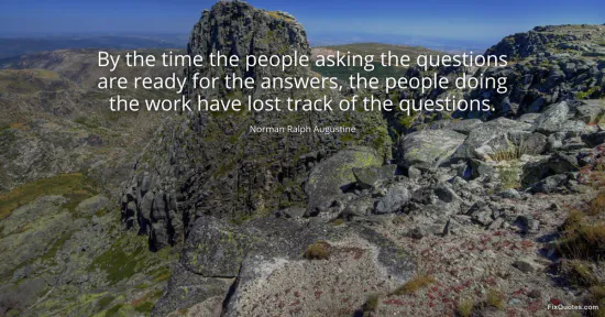 Augustine, Norman Ralph. (2026, January 16). By the time the people asking the questions are ready for the answers, the people doing the work have lost track of the questions. FixQuotes. https://fixquotes.com/quotes/by-the-time-the-people-asking-the-questions-are-128167/