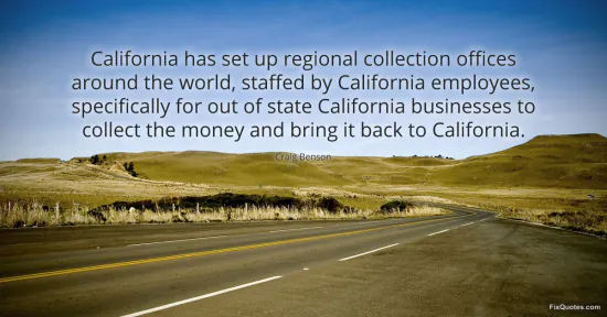 Benson, Craig. "California has set up regional collection offices around the world, staffed by California employees, specifically for out of state California businesses to collect the money and bring it back to California." FixQuotes. January 15, 2026. https://fixquotes.com/quotes/california-has-set-up-regional-collection-offices-140176/.