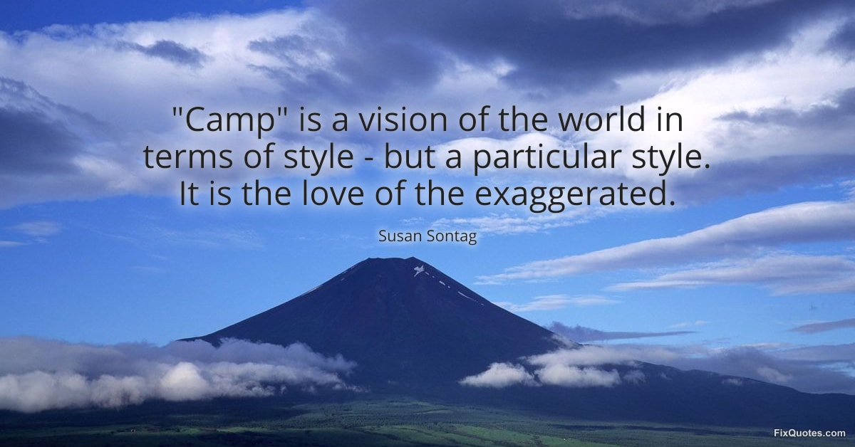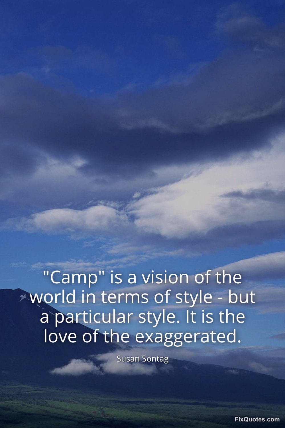 Sontag, Susan. (2026, January 16). "Camp" is a vision of the world in terms of style - but a particular style. It is the love of the exaggerated. FixQuotes. https://fixquotes.com/quotes/camp-is-a-vision-of-the-world-in-terms-of-style-102510/