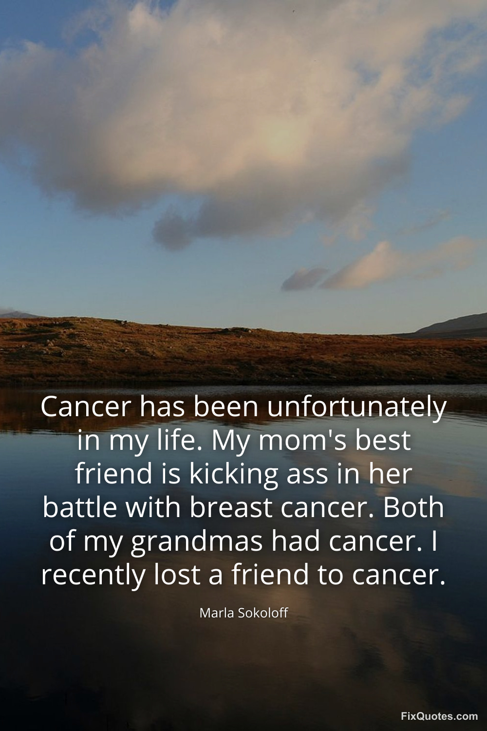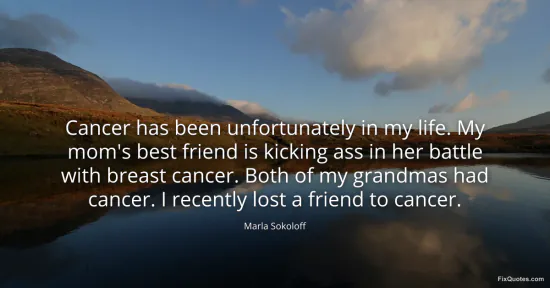 Sokoloff, Marla. (2026, January 16). Cancer has been unfortunately in my life. My mom's best friend is kicking ass in her battle with breast cancer. Both of my grandmas had cancer. I recently lost a friend to cancer. FixQuotes. https://fixquotes.com/quotes/cancer-has-been-unfortunately-in-my-life-my-moms-122732/