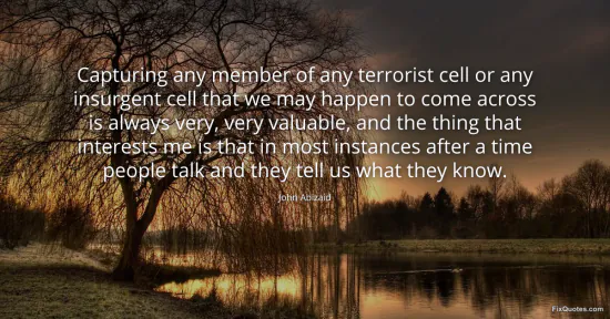 Abizaid, John. "Capturing any member of any terrorist cell or any insurgent cell that we may happen to come across is always very, very valuable, and the thing that interests me is that in most instances after a time people talk and they tell us what they know." FixQuotes. January 18, 2026. https://fixquotes.com/quotes/capturing-any-member-of-any-terrorist-cell-or-any-6580/.