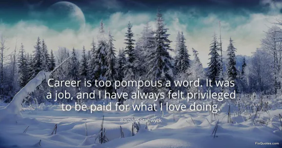 Stanwyck, Barbara. (2026, January 17). Career is too pompous a word. It was a job, and I have always felt privileged to be paid for what I love doing. FixQuotes. https://fixquotes.com/quotes/career-is-too-pompous-a-word-it-was-a-job-and-i-39904/