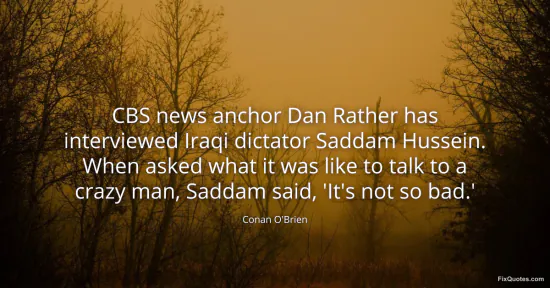 O'Brien, Conan. (2026, January 16). CBS news anchor Dan Rather has interviewed Iraqi dictator Saddam Hussein. When asked what it was like to talk to a crazy man, Saddam said, 'It's not so bad.'. FixQuotes. https://fixquotes.com/quotes/cbs-news-anchor-dan-rather-has-interviewed-iraqi-86366/