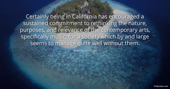 Ferneyhough, Brian. "Certainly being in California has encouraged a sustained commitment to rethinking the nature, purposes, and relevance of the contemporary arts, specifically music, for a society which by and large seems to manage quite well without them." FixQuotes. January 17, 2026. https://fixquotes.com/quotes/certainly-being-in-california-has-encouraged-a-66913/.