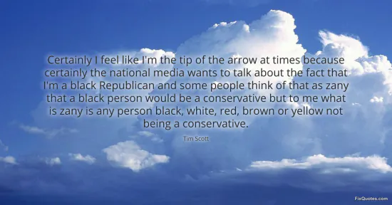 Scott, Tim. "Certainly I feel like I'm the tip of the arrow at times because certainly the national media wants to talk about the fact that I'm a black Republican and some people think of that as zany that a black person would be a conservative but to me what is zany is any person black, white, red, brown or yellow not being a conservative." FixQuotes. January 15, 2026. https://fixquotes.com/quotes/certainly-i-feel-like-im-the-tip-of-the-arrow-at-145304/.