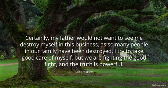 Sheppard, Sam. "Certainly, my father would not want to see me destroy myself in this business, as so many people in our family have been destroyed. I try to take good care of myself, but we are fighting the good fight, and the truth is powerful." FixQuotes. January 15, 2026. https://fixquotes.com/quotes/certainly-my-father-would-not-want-to-see-me-170620/.