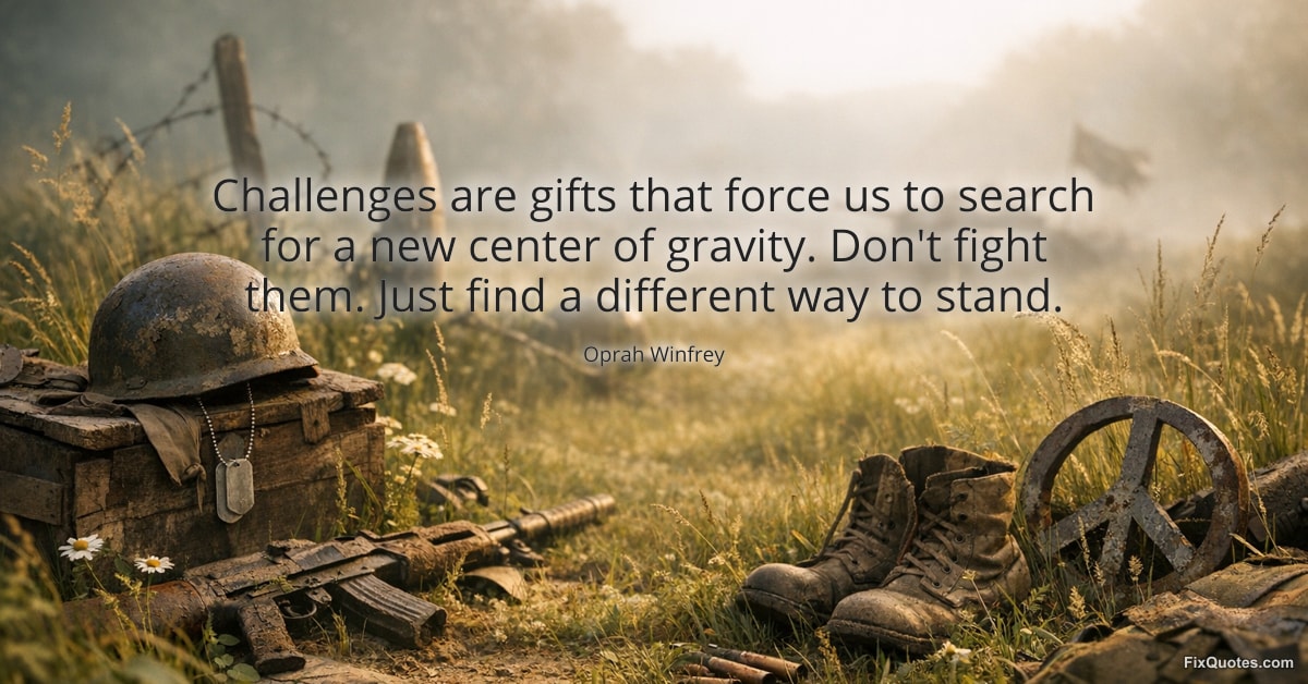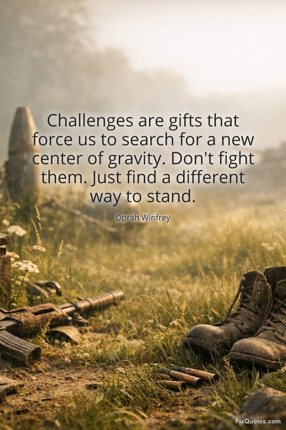 Winfrey, Oprah. (2026, February 7). Challenges are gifts that force us to search for a new center of gravity. Don't fight them. Just find a different way to stand. FixQuotes. https://fixquotes.com/quotes/challenges-are-gifts-that-force-us-to-search-for-171483/