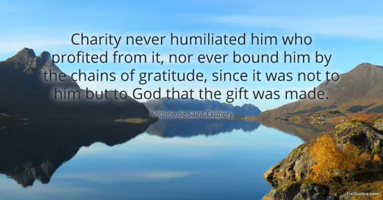Saint-Exupery, Antoine de. (2026, January 17). Charity never humiliated him who profited from it, nor ever bound him by the chains of gratitude, since it was not to him but to God that the gift was made. FixQuotes. https://fixquotes.com/quotes/charity-never-humiliated-him-who-profited-from-it-29900/
