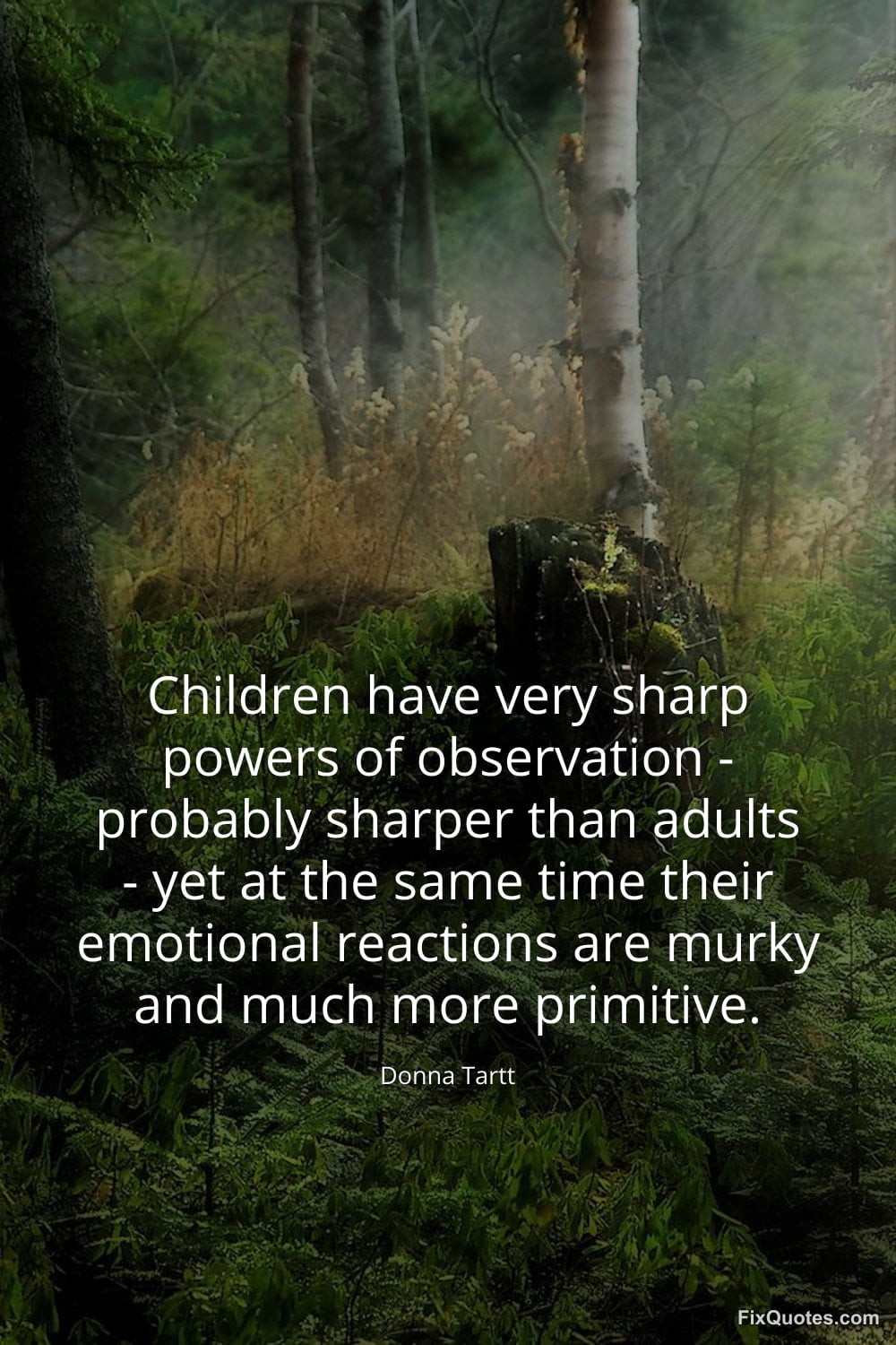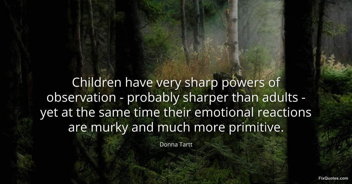 Tartt, Donna. (2026, January 15). Children have very sharp powers of observation - probably sharper than adults - yet at the same time their emotional reactions are murky and much more primitive. FixQuotes. https://fixquotes.com/quotes/children-have-very-sharp-powers-of-observation-143568/