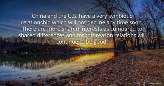 Mobius, Mark. (2026, January 16). China and the U.S. have a very symbiotic relationship which will not decline any time soon. There are more shared interests as compared to shared differences and for this reason relations will continue to be good. FixQuotes. https://fixquotes.com/quotes/china-and-the-us-have-a-very-symbiotic-127172/