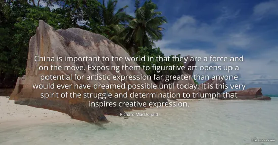MacDonald, Richard. "China is important to the world in that they are a force and on the move. Exposing them to figurative art opens up a potential for artistic expression far greater than anyone would ever have dreamed possible until today. It is this very spirit of the struggle and determination to triumph that inspires creative expression." FixQuotes. January 16, 2026. https://fixquotes.com/quotes/china-is-important-to-the-world-in-that-they-are-90755/.