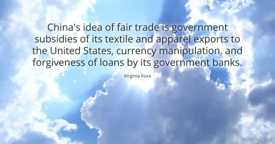 Foxx, Virginia. "China's idea of fair trade is government subsidies of its textile and apparel exports to the United States, currency manipulation, and forgiveness of loans by its government banks." FixQuotes. January 16, 2026. https://fixquotes.com/quotes/chinas-idea-of-fair-trade-is-government-subsidies-106067/.