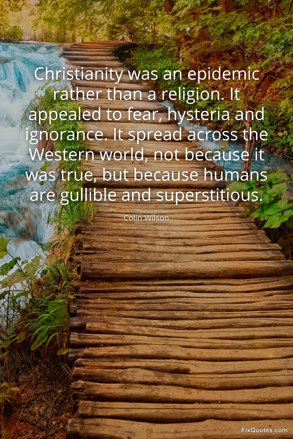 Wilson, Colin. (2026, January 15). Christianity was an epidemic rather than a religion. It appealed to fear, hysteria and ignorance. It spread across the Western world, not because it was true, but because humans are gullible and superstitious. FixQuotes. https://fixquotes.com/quotes/christianity-was-an-epidemic-rather-than-a-173509/