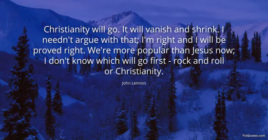 "Christianity will go. It will vanish and shrink. I needn't argue with that; I'm right and I will be proved right. We're more popular than Jesus now; I don't know which will go first - rock and roll or Christianity." FixQuotes, 17 Jan. 2026, https://fixquotes.com/quotes/christianity-will-go-it-will-vanish-and-shrink-i-24834/. Accessed 7 Feb. 2026.