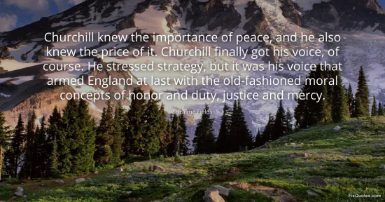 Fields, Suzanne. "Churchill knew the importance of peace, and he also knew the price of it. Churchill finally got his voice, of course. He stressed strategy, but it was his voice that armed England at last with the old-fashioned moral concepts of honor and duty, justice and mercy." FixQuotes. January 16, 2026. https://fixquotes.com/quotes/churchill-knew-the-importance-of-peace-and-he-86546/.