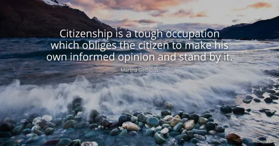 Gellhorn, Martha. "Citizenship is a tough occupation which obliges the citizen to make his own informed opinion and stand by it." FixQuotes. January 16, 2026. https://fixquotes.com/quotes/citizenship-is-a-tough-occupation-which-obliges-89440/.