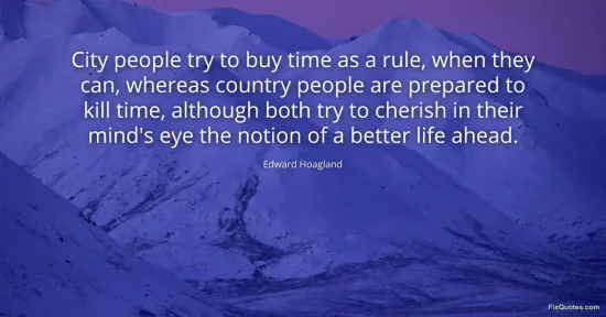 Hoagland, Edward. "City people try to buy time as a rule, when they can, whereas country people are prepared to kill time, although both try to cherish in their mind's eye the notion of a better life ahead." FixQuotes. January 17, 2026. https://fixquotes.com/quotes/city-people-try-to-buy-time-as-a-rule-when-they-58196/.