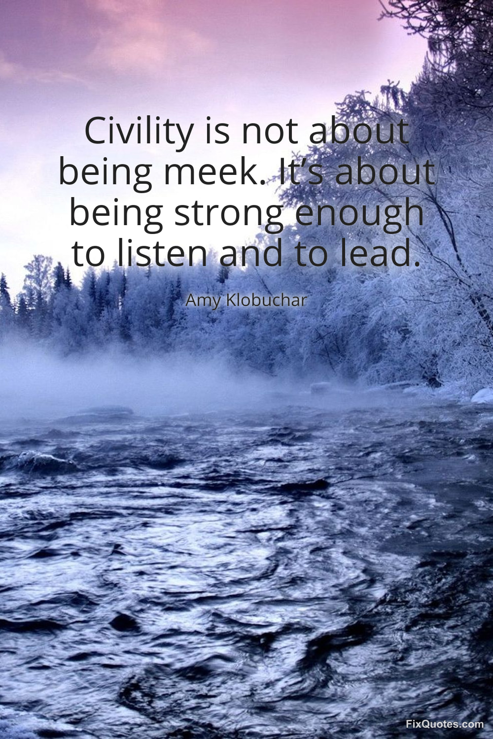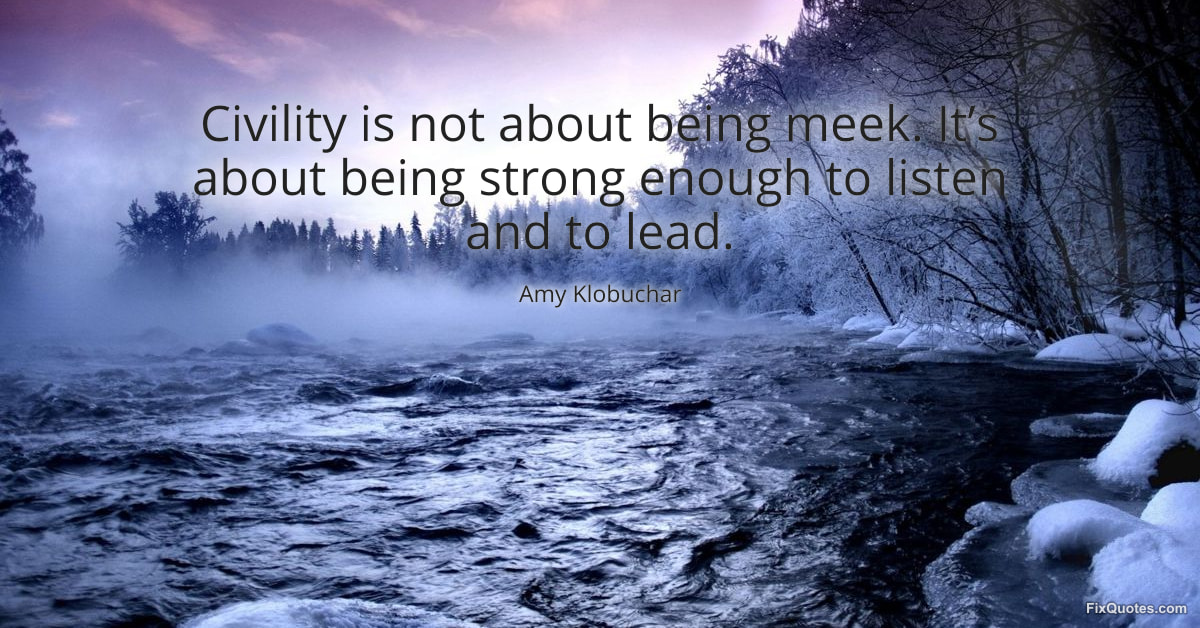 Klobuchar, Amy. "Civility is not about being meek. It’s about being strong enough to listen and to lead." FixQuotes. January 30, 2026. https://fixquotes.com/quotes/civility-is-not-about-being-meek-its-about-being-184781/.