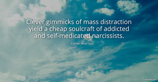 West, Cornel. (2026, January 17). Clever gimmicks of mass distraction yield a cheap soulcraft of addicted and self-medicated narcissists. FixQuotes. https://fixquotes.com/quotes/clever-gimmicks-of-mass-distraction-yield-a-cheap-51449/