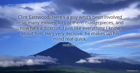 "Clint Eastwood. Here's a guy who's been involved in so many movies, lots of them masterpieces, and now he's a director. I just like everything I know about him. He's very decisive, he makes up his mind real quick." FixQuotes, 16 Jan. 2026, https://fixquotes.com/quotes/clint-eastwood-heres-a-guy-whos-been-involved-in-109533/. Accessed 12 Feb. 2026.