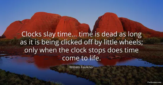 Faulkner, William. (2026, January 15). Clocks slay time... time is dead as long as it is being clicked off by little wheels; only when the clock stops does time come to life. FixQuotes. https://fixquotes.com/quotes/clocks-slay-time-time-is-dead-as-long-as-it-is-2417/