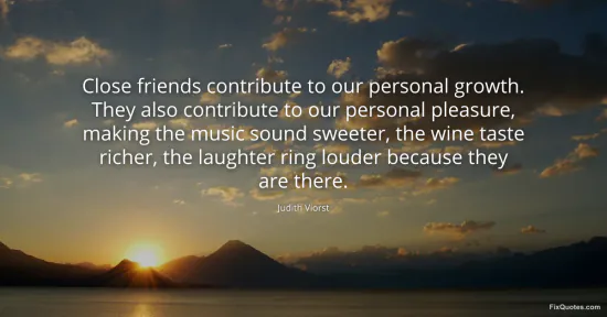 Viorst, Judith. (2026, January 16). Close friends contribute to our personal growth. They also contribute to our personal pleasure, making the music sound sweeter, the wine taste richer, the laughter ring louder because they are there. FixQuotes. https://fixquotes.com/quotes/close-friends-contribute-to-our-personal-growth-107323/