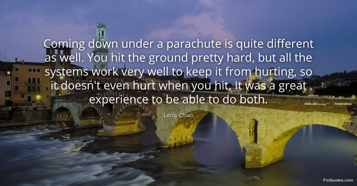Chiao, Leroy. (2026, January 16). Coming down under a parachute is quite different as well. You hit the ground pretty hard, but all the systems work very well to keep it from hurting, so it doesn't even hurt when you hit. It was a great experience to be able to do both. FixQuotes. https://fixquotes.com/quotes/coming-down-under-a-parachute-is-quite-different-134006/