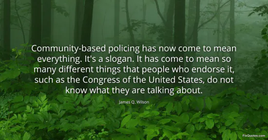 Wilson, James Q. "Community-based policing has now come to mean everything. It's a slogan. It has come to mean so many different things that people who endorse it, such as the Congress of the United States, do not know what they are talking about." FixQuotes. January 16, 2026. https://fixquotes.com/quotes/community-based-policing-has-now-come-to-mean-85216/.
