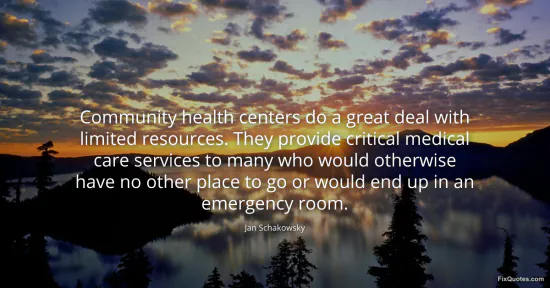Schakowsky, Jan. "Community health centers do a great deal with limited resources. They provide critical medical care services to many who would otherwise have no other place to go or would end up in an emergency room." FixQuotes. January 17, 2026. https://fixquotes.com/quotes/community-health-centers-do-a-great-deal-with-56448/.