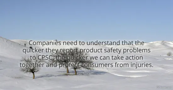 Stratton, Hal. "Companies need to understand that the quicker they report product safety problems to CPSC, the quicker we can take action together and protect consumers from injuries." FixQuotes. January 16, 2026. https://fixquotes.com/quotes/companies-need-to-understand-that-the-quicker-131950/.