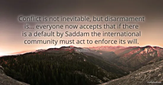 Blair, Tony. (2026, January 15). Conflict is not inevitable, but disarmament is... everyone now accepts that if there is a default by Saddam the international community must act to enforce its will. FixQuotes. https://fixquotes.com/quotes/conflict-is-not-inevitable-but-disarmament-is-27835/