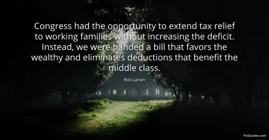 Larsen, Rick. "Congress had the opportunity to extend tax relief to working families without increasing the deficit. Instead, we were handed a bill that favors the wealthy and eliminates deductions that benefit the middle class." FixQuotes. January 17, 2026. https://fixquotes.com/quotes/congress-had-the-opportunity-to-extend-tax-relief-79581/.