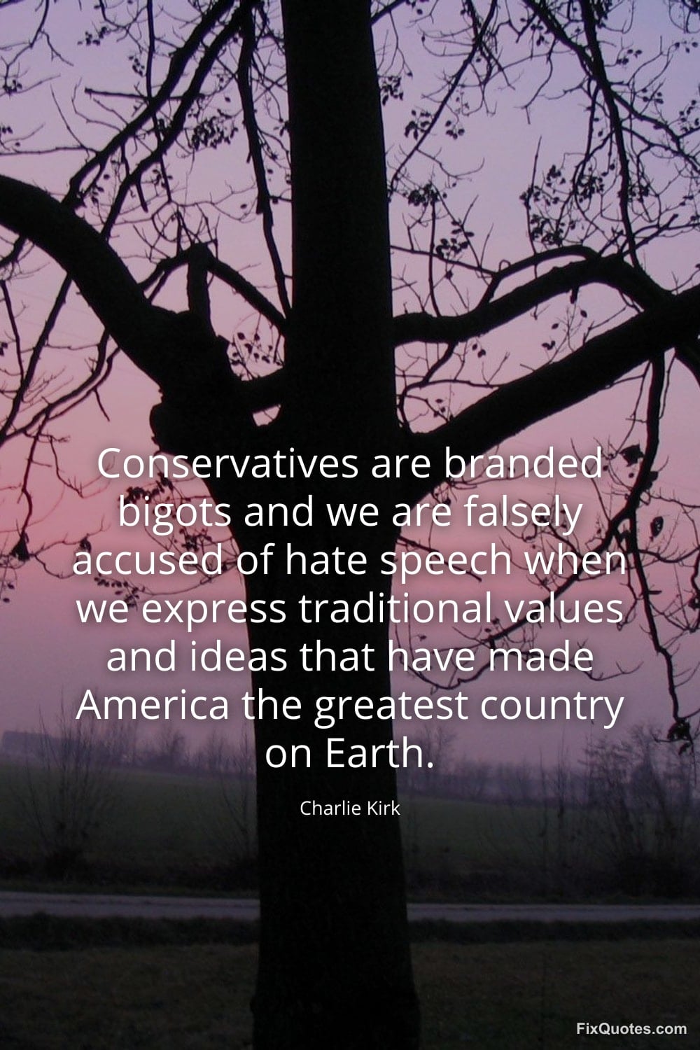 Kirk, Charlie. "Conservatives are branded bigots and we are falsely accused of hate speech when we express traditional values and ideas that have made America the greatest country on Earth." FixQuotes. February 12, 2026. https://fixquotes.com/quotes/conservatives-are-branded-bigots-and-we-are-173203/.