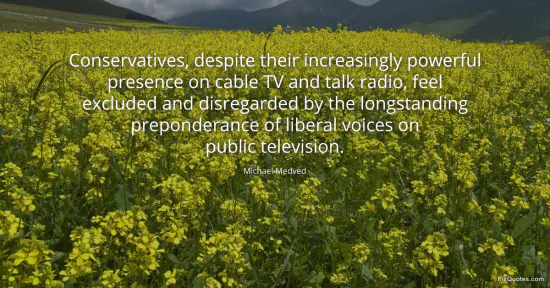 Medved, Michael. (2026, January 16). Conservatives, despite their increasingly powerful presence on cable TV and talk radio, feel excluded and disregarded by the longstanding preponderance of liberal voices on public television. FixQuotes. https://fixquotes.com/quotes/conservatives-despite-their-increasingly-powerful-88824/