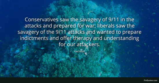 Rove, Karl. "Conservatives saw the savagery of 9/11 in the attacks and prepared for war; liberals saw the savagery of the 9/11 attacks and wanted to prepare indictments and offer therapy and understanding for our attackers." FixQuotes. January 16, 2026. https://fixquotes.com/quotes/conservatives-saw-the-savagery-of-9-11-in-the-118682/.