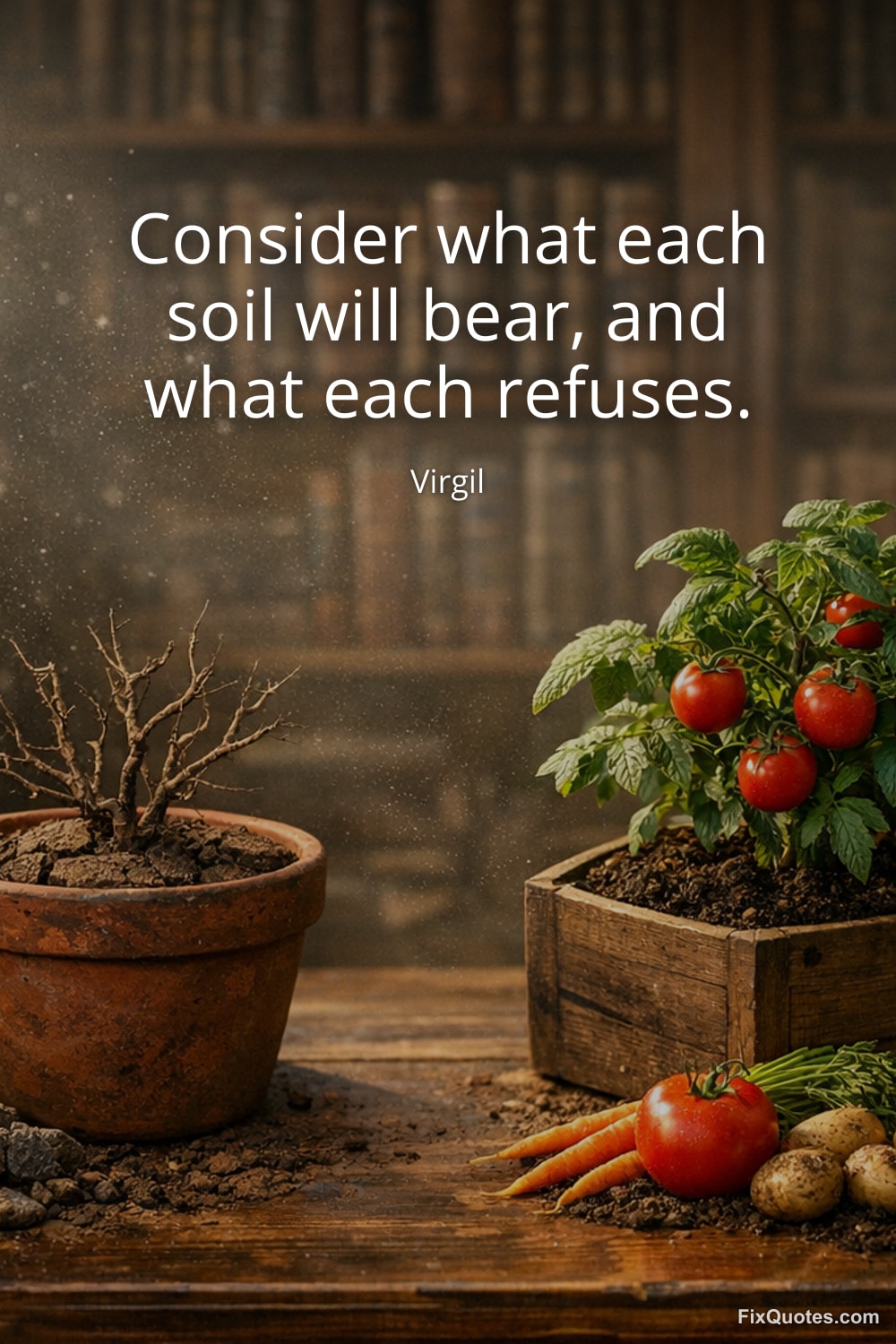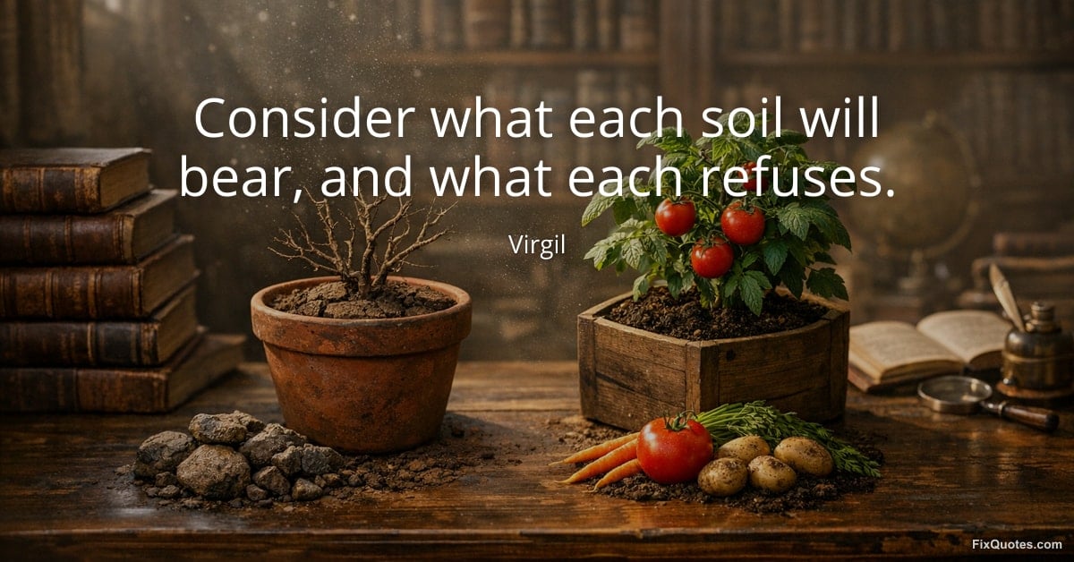 Virgil. "Consider what each soil will bear, and what each refuses." FixQuotes. February 7, 2026. https://fixquotes.com/quotes/consider-what-each-soil-will-bear-and-what-each-8671/.