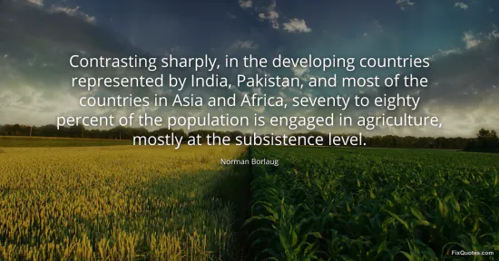 Borlaug, Norman. (2026, January 18). Contrasting sharply, in the developing countries represented by India, Pakistan, and most of the countries in Asia and Africa, seventy to eighty percent of the population is engaged in agriculture, mostly at the subsistence level. FixQuotes. https://fixquotes.com/quotes/contrasting-sharply-in-the-developing-countries-5366/