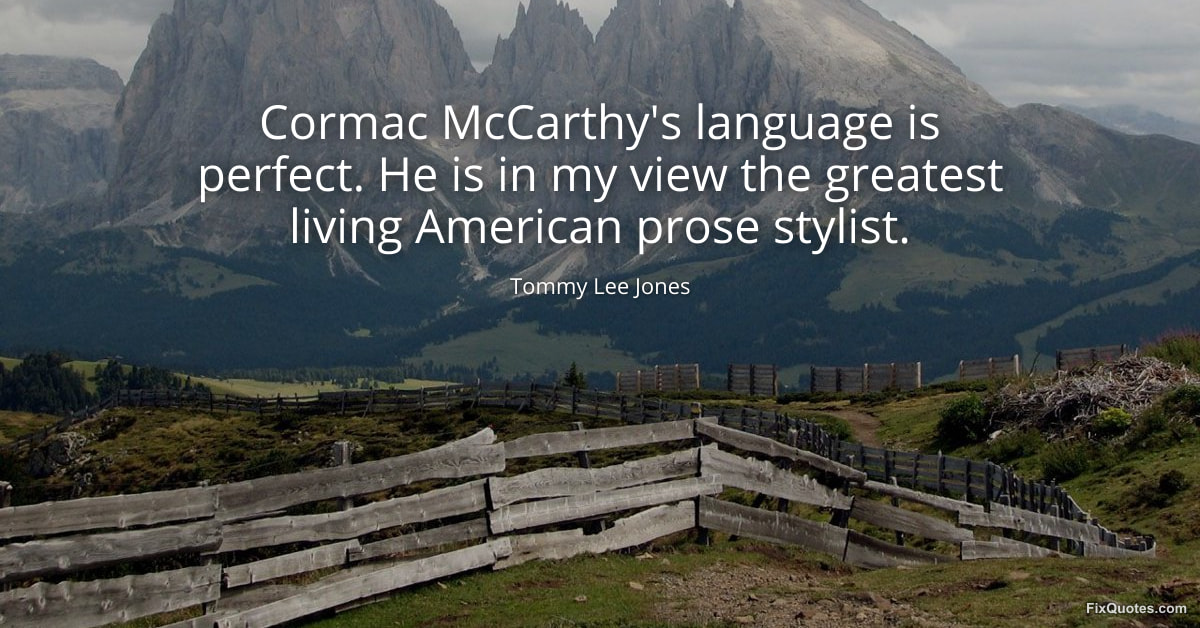 Jones, Tommy Lee. "Cormac McCarthy's language is perfect. He is in my view the greatest living American prose stylist." FixQuotes. January 11, 2026. https://fixquotes.com/quotes/cormac-mccarthys-language-is-perfect-he-is-in-my-183744/.