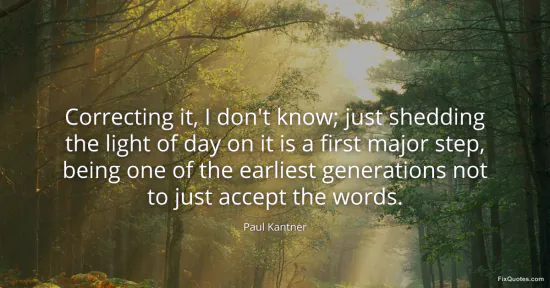 Kantner, Paul. "Correcting it, I don't know; just shedding the light of day on it is a first major step, being one of the earliest generations not to just accept the words." FixQuotes. January 16, 2026. https://fixquotes.com/quotes/correcting-it-i-dont-know-just-shedding-the-light-115063/.