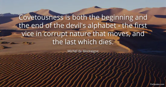 Montaigne, Michel de. "Covetousness is both the beginning and the end of the devil's alphabet - the first vice in corrupt nature that moves, and the last which dies." FixQuotes. January 18, 2026. https://fixquotes.com/quotes/covetousness-is-both-the-beginning-and-the-end-of-871/.
