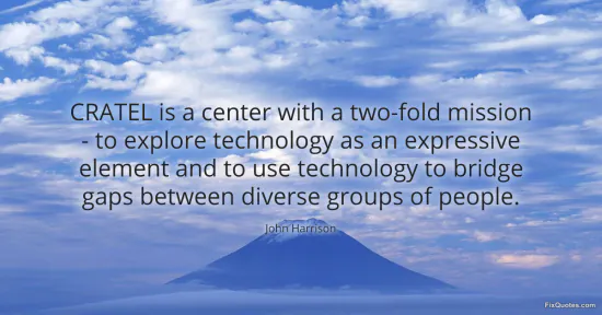 Harrison, John. "CRATEL is a center with a two-fold mission - to explore technology as an expressive element and to use technology to bridge gaps between diverse groups of people." FixQuotes. January 18, 2026. https://fixquotes.com/quotes/cratel-is-a-center-with-a-two-fold-mission-to-11508/.